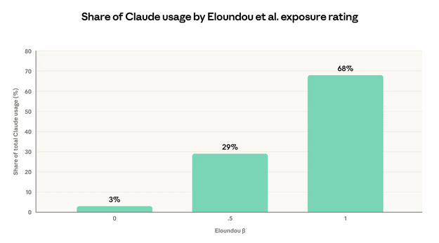 Рисунок 1: Доля использования Claude по рейтингу экспозиции задач от Eloundou et al.