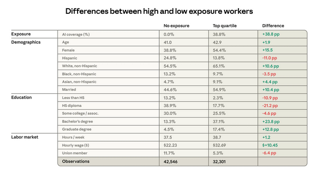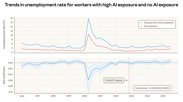 В этом отчёте представлена новая метрика для понимания воздействия ИИ на рынок труда и изучено влияние на безработицу и найм. Рабочие места в большей степени экспонированы к ИИ в той мере, в какой их задачи теоретически выполнимы с помощью LLM и наблюдаются на наших платформах в автоматизированных, связанных с работой сценариях использования. Мы обнаруживаем, что среди наиболее экспонированных оказываются программисты, специалисты по обслуживанию клиентов и финансовые аналитики. Используя данные опросов по США, мы не находим влияния на уровень безработицы для работников в наиболее экспонированных профессиях, хотя имеются предварительные свидетельства того, что найм в эти профессии несколько замедлился для работников в возрасте 22–25 лет.