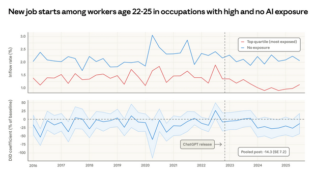 Верхняя панель показывает процент молодых работников, начинающих новую работу в профессиях с высокой и нулевой экспозицией. Нижняя панель измеряет разрыв между этими двумя рядами в рамках модели «разность разностей».